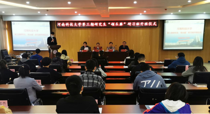 11月1日上午,由党委研究生工作部主办的河南科技大学第三期研究生“领头雁”研习班开班仪式在开元校区工科1号楼5059报告厅举行。仪式由研工部思政教育科科长陈洁老师主持,研工部部长刘素芹老师、副部长张静老师、研究生管理科科长王泽远老师、研习班相关负责人员和研习班全体学员参加。