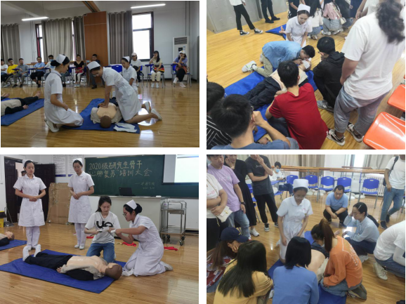 护理学院急救培训团队师生以生动的语言为骨干培训班学员们讲解了心肺复苏现场急救内容,介绍了心肺复苏的三个核心步骤,并利用实物人体模型进行细致、规范的现场演示。为研究生普及医疗急救知识,让同学们学习常用医疗急救方法和面对突发状况时的应对措施,掌握心肺复苏急救技能。