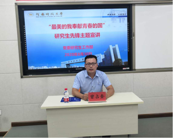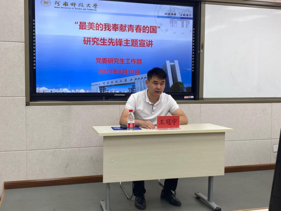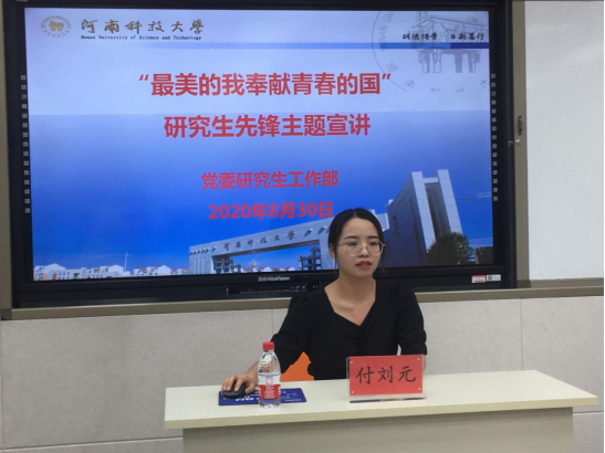 8月30日下午,河南科技大学党委研究生工作部举办的“最美的我奉献青春的国”研究生先锋主题宣讲活动在腾讯会议线上举行。研究生“十佳学术之星”获得者、农学院2019级博士研究生曾占奎,研究生国家奖学金获得者林学院2018级硕士研究生付刘元,抗疫一线志愿者代表护理学院2019级硕士研究生王冠宇,分别与100名2020级研究生骨干同学分享了自己的科研经历、学习心得和抗疫一线故事。宣讲活动由马克思主义学院研究生赵思维同学主持。
