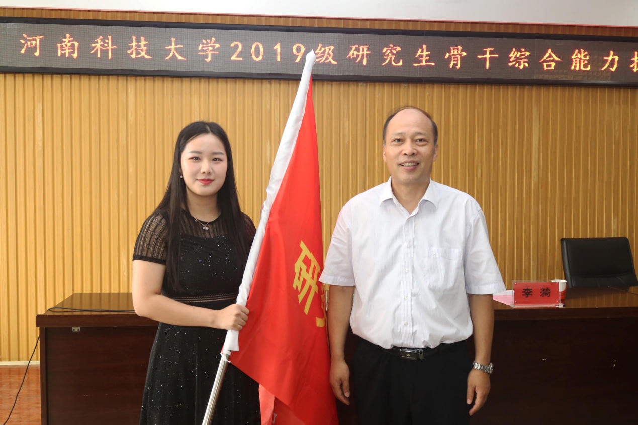 李漪为培训班授旗,并对培训班学员们提出三点要求:一是要珍惜学习机会,认真总结反思,真正做到学有所成;二是要立足研究生学习工作实际,积极开拓进取,努力投身科研事业;三是要发挥新生骨干带头作用,不忘初心,开拓进取,做德智体美劳全面发展的社会主义建设者和接班人。