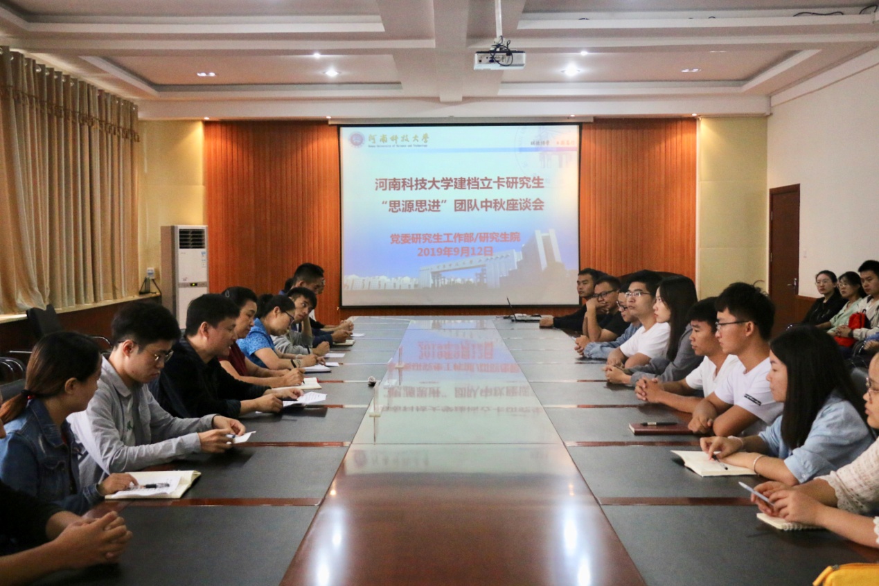 9月12日中午,建档立卡研究生“思源思进”团队中秋座谈会在工科2号楼308室举行。党委研究生工作部部长王晓梅教授、副部长张静老师、研究生教育管理科科长陈建峰老师和来自各培养单位的建档立卡研究生欢聚一堂,展开交流。