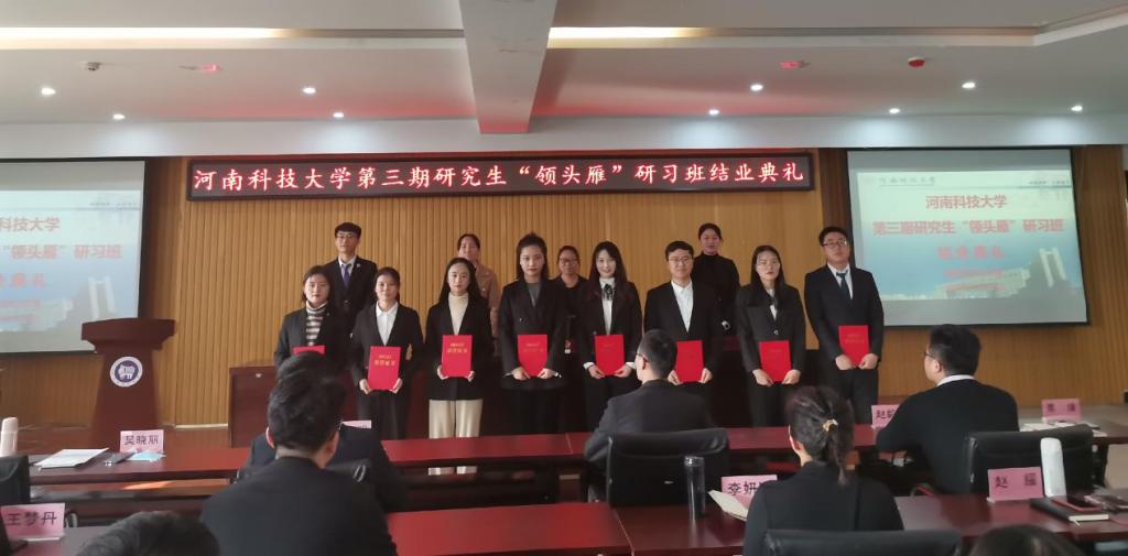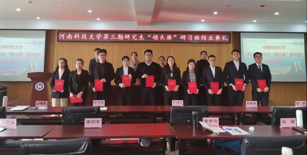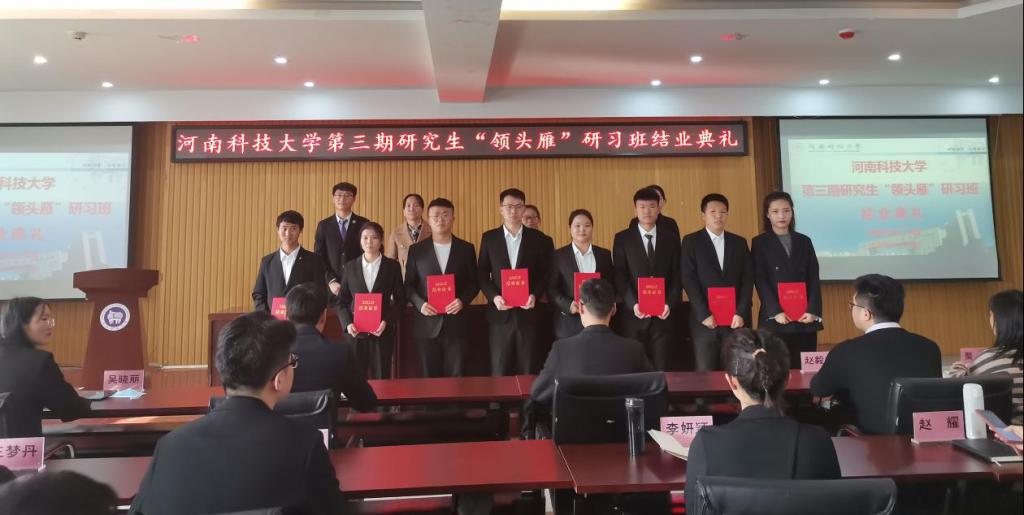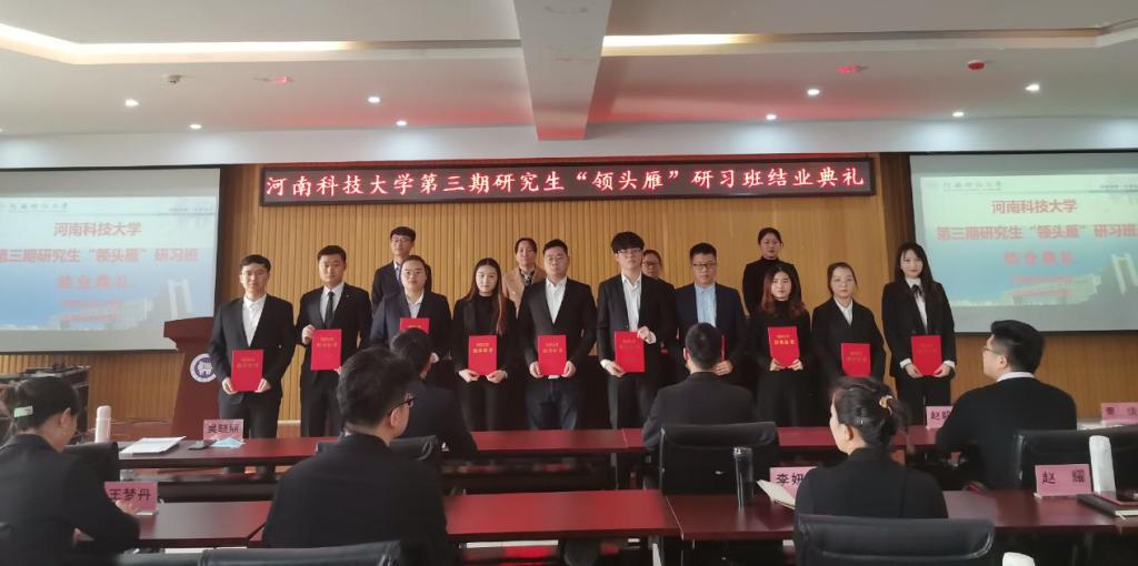典礼伊始,石欣隆宣读河南科技大学第三期研究生“领头雁”研习班结业名单,陈洁老师宣读《河南科技大学关于对第三期研究生“领头雁”研习班优秀学员表彰的决定》。与会老师为研习班学员、优秀学员颁发证书。随后,研习班优秀学员代表吴晓丽发言,她提出在这个璀璨的时代,作为一名学生干部,一名“领头雁”,应当做到守初心、担使命、知难而进、坚韧向前。