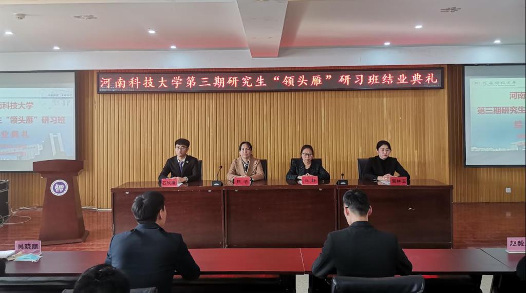 11月29日上午,河南科技大学第三期研究生“领头雁”研习班结业典礼在工科1号楼5059报告厅举办。党委研究生工作部副部长张静老师、思政教育科科长陈洁老师、“领头雁”研习班助教石欣隆、班长裴林玉及第三期研究生“领头雁”研习班全体学员参加。典礼由研习班班长裴林玉主持。