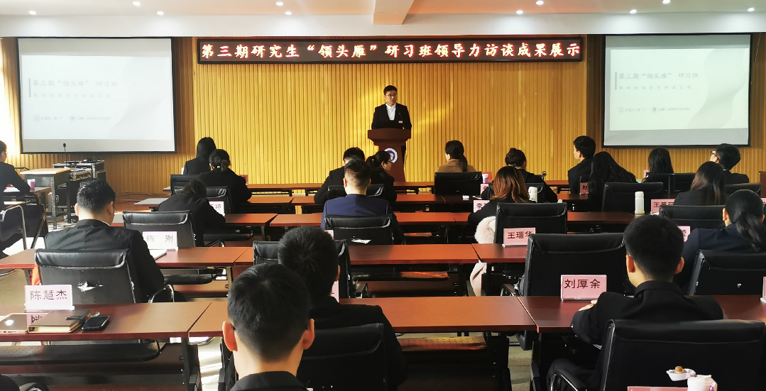 11月29日上午,河南科技大学第三期研究生“领头雁”研习班领导力访谈成果展示在开元校区工科1号楼5059举行,党委研究生工作部副部长张静老师、研工部思政教育科科长陈洁老师、研习班相关负责人员和研习班全体学员参加,本次汇报由机电工程学院2019级研究生张广主持。