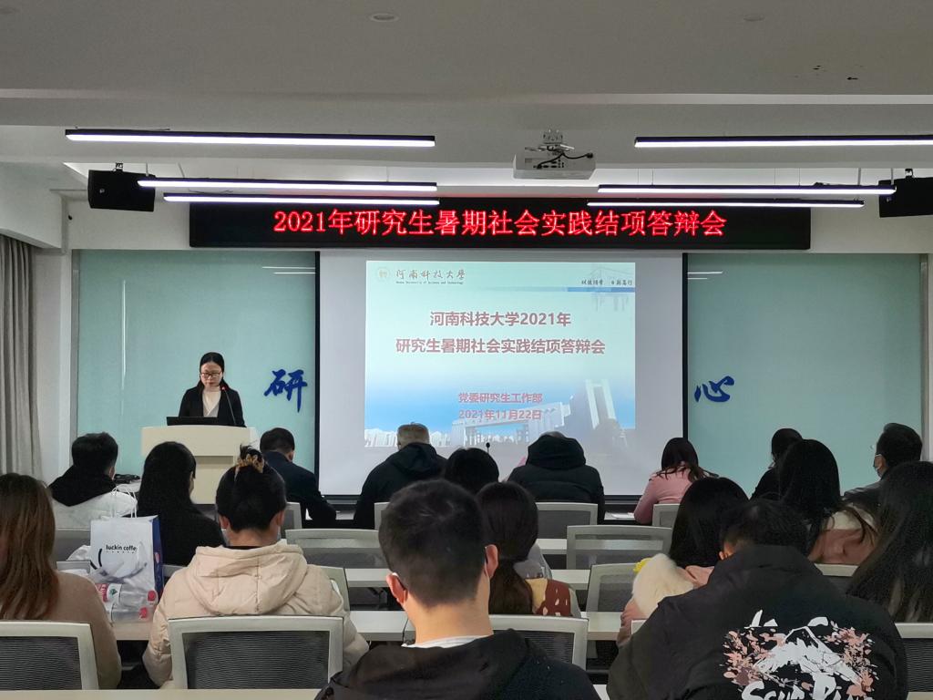 11月22日下午,河南科技大学2021年研究生暑期社会实践结项答辩会在开元校区研究生跨学科交流中心举行。原军工研究院院长李航、党委组织部副部长王淑敏、学生处副处长翟国安、校团委副书记孔蓓蓓、信息工程学院副院长张志勇为特邀评委,党委研究生工作部副部长张静、研究生管理科科长王泽远和各研究生暑期社会实践团队代表参加会议。会议由医学技术与工程学院2021级研究生刘力霈主持。