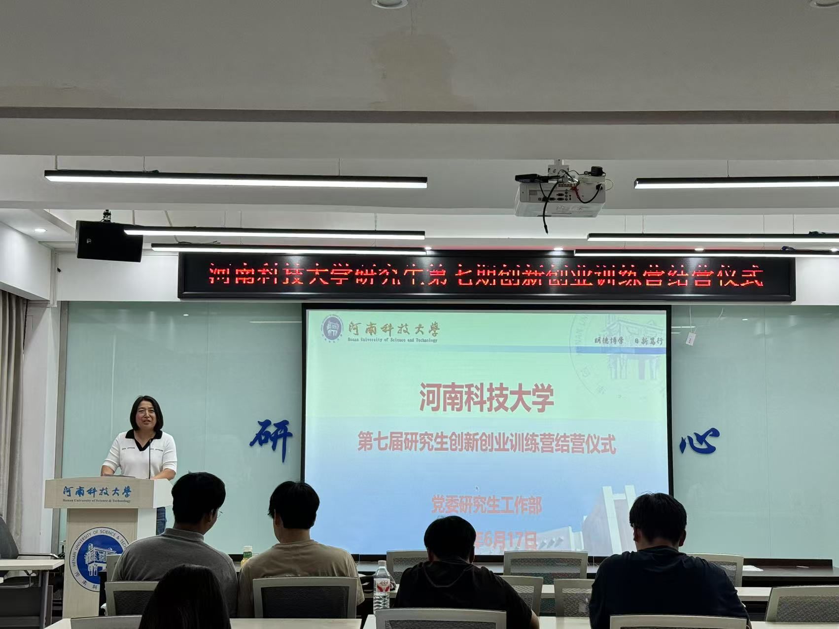2025年6月17日下午,河南科技大学第七期研究生创新创业训练营结营仪式在开元校区研究生跨学科交流中心举行。党委研究生工作部研究生管理科科长盛延云老师出席仪式,训练营全体学员参加。仪式由商学院2024级研究生卢平主持。
