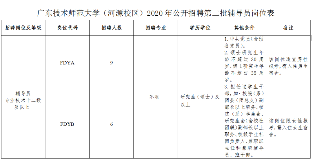 具体详见《广东技术师范大学2020年公开招聘辅导员岗位表》(见附件1)。