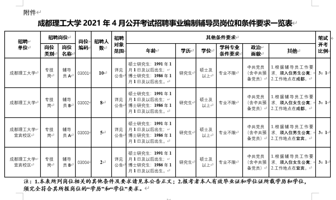面向全国招聘2021年7月31日前取得普通高等教育研究生学历和硕士及以上学位,并完全符合《成都理工大学2021年4月公开考试招聘事业编制辅导员岗位和条件要求一览表》(附件,含表注,以下简称《岗位和条件要求一览表》)相关岗位条件要求和本公告其他要求的人员。其中,2021年高校应届毕业生必须在2021年7月31日前取得符合岗位条件要求的毕业证等证书,并凭证书办理确认等手续;其他报考者必须在面试资格审查前取得符合岗位条件要求的国家承认学历的毕业证、学位证等证书。未在规定时间内取得并提供有关证书的,视为报考者自动放弃,责任自负。2021年8月1日之后毕业的在读生不属于此次公招的范围。