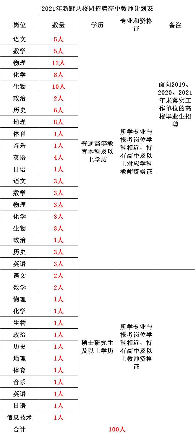 根据《事业单位公开招聘人员暂行规定》(人事部第6号令)、《河南省事业单位公开招聘工作规程》(豫人社〔2015〕55号)和《关于进一步规范全市事业单位公开招聘工作的通知》(宛人社〔2017〕24号)精神,经新野县公开招聘事业单位工作人员工作领导小组研究决定,结合单位编制、岗位空缺情况及工作需要,新野县采取校园招聘形式面向社会公开招聘高中教师100名点击获取职位表。现将有关事宜公告如下: