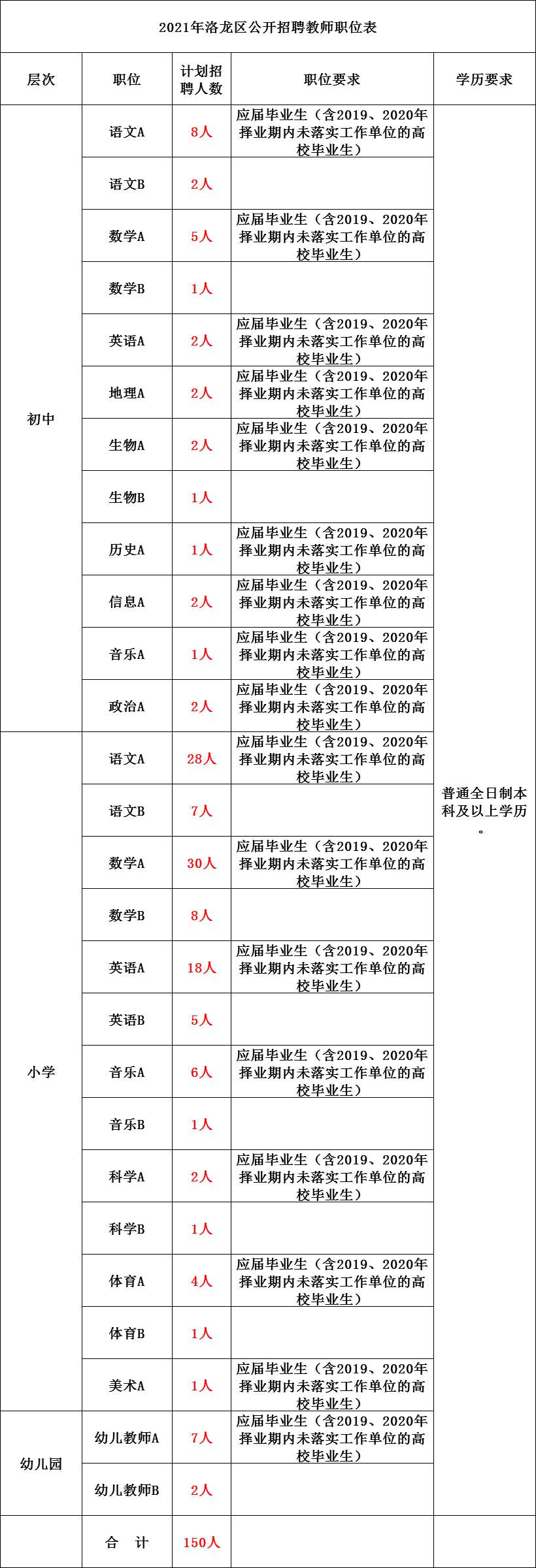 为进一步充实洛龙区教师队伍,促进教育事业良性健康发展。经洛龙区委、区政府同意,决定面向社会公开招聘教师150名点击获取职位表(全供事业编制,其中:中小学教师141名、幼儿教师9名)。依据《事业单位公开招聘人员暂行规定》(中华人民共和国人事部令第6号)、《关于做好全省事业单位公开招聘高校毕业生工作有关问题的通知》(豫人社办〔2020〕33号)及省、市事业单位公开招聘有关规定,现制定招聘工作方案如下: