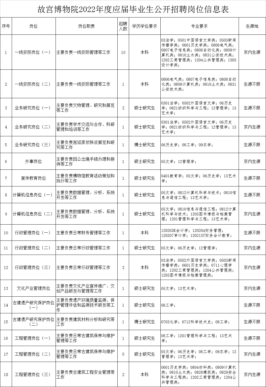 招聘岗位详见《故宫博物院2022年度应届毕业生公开招聘岗位信息表》。岗位学历要求为应聘人员已获得或即将获得的最高学历,岗位专业要求为应聘人员已获得或即将获得的最高学历对应专业。专业参照教育部《普通高等学校本科专业目录(2020年版)》和《学位授予和人才培养学科目录(2018年版)》及研招网最新信息。所学学科专业不在选定的参考目录中,但与岗位所要求的学科专业类同的应聘人员,可主动联系我院确认报名资格。