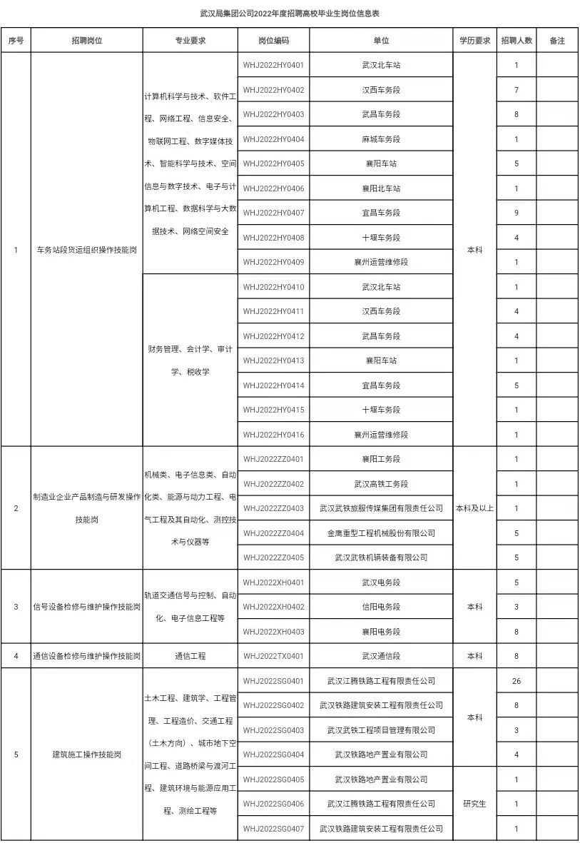 中国铁路武汉局集团有限公司根据企业经营发展需求,拟招聘普通高等院校本科及以上学历毕业生,现将有关事项公告如下: