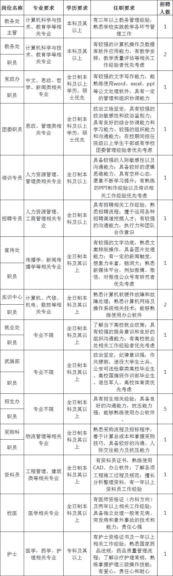 3、保险福利:人事关系转入学院,统一购买养老、医疗、失业等社会保险,符合条件人员可申请住房公积金。