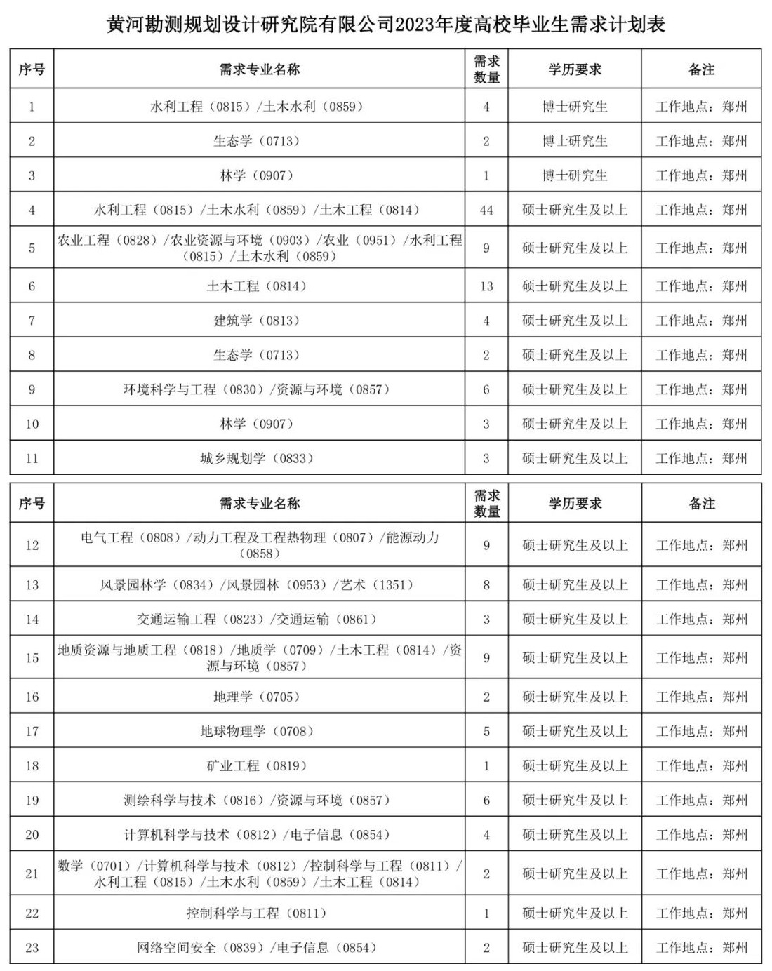 招聘计划和学历要求见《黄河勘测规划设计研究院有限公司2023年度高校毕业生需求计划表》。
