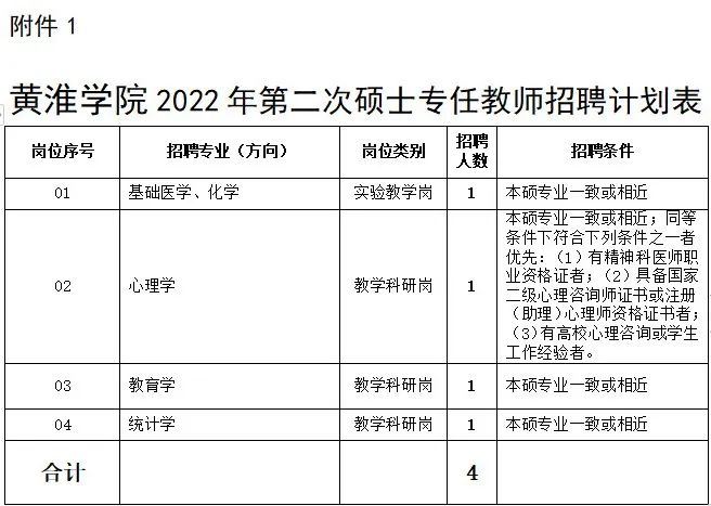 6. 应聘岗位所需的其他条件,详见《黄淮学院2022年第二次硕士专任教师招聘计划表》(附件1)。