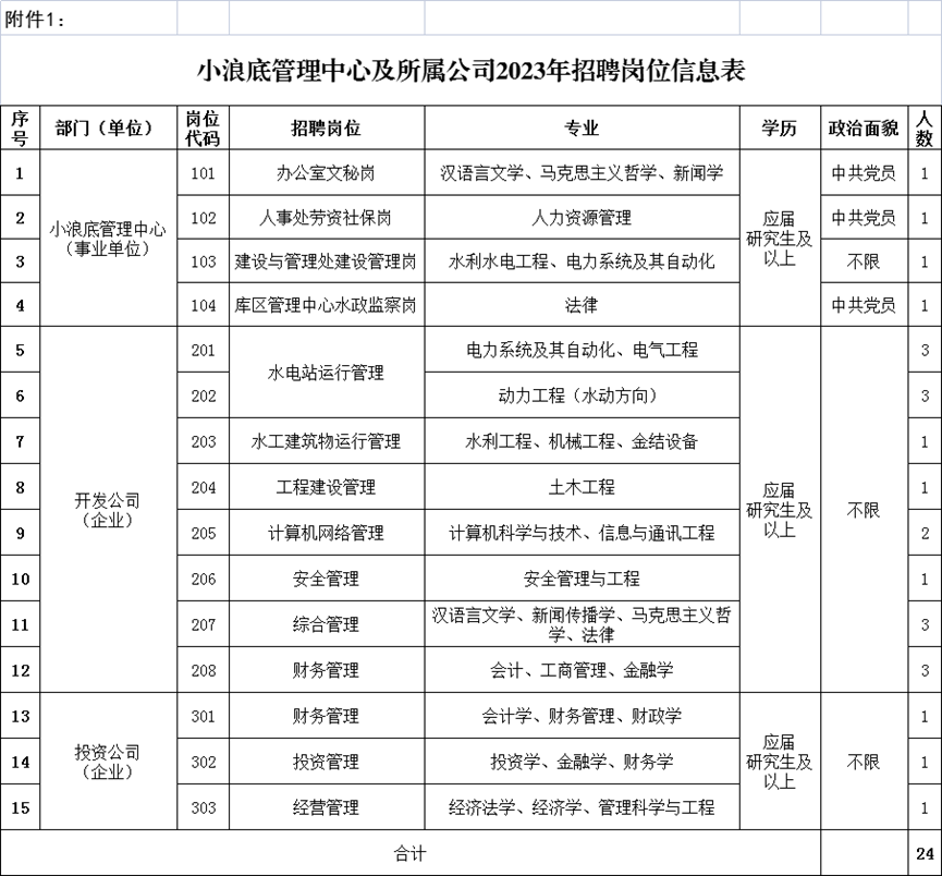 根据工作需要,水利部小浪底水利枢纽管理中心(简称小浪底管理中心)及所属黄河水利水电开发集团有限公司(简称开发公司)、黄河小浪底水资源投资有限公司(简称投资公司)2023年度拟公开招聘工作人员24名,其中中心机关及直属单位4名,所属公司20名。