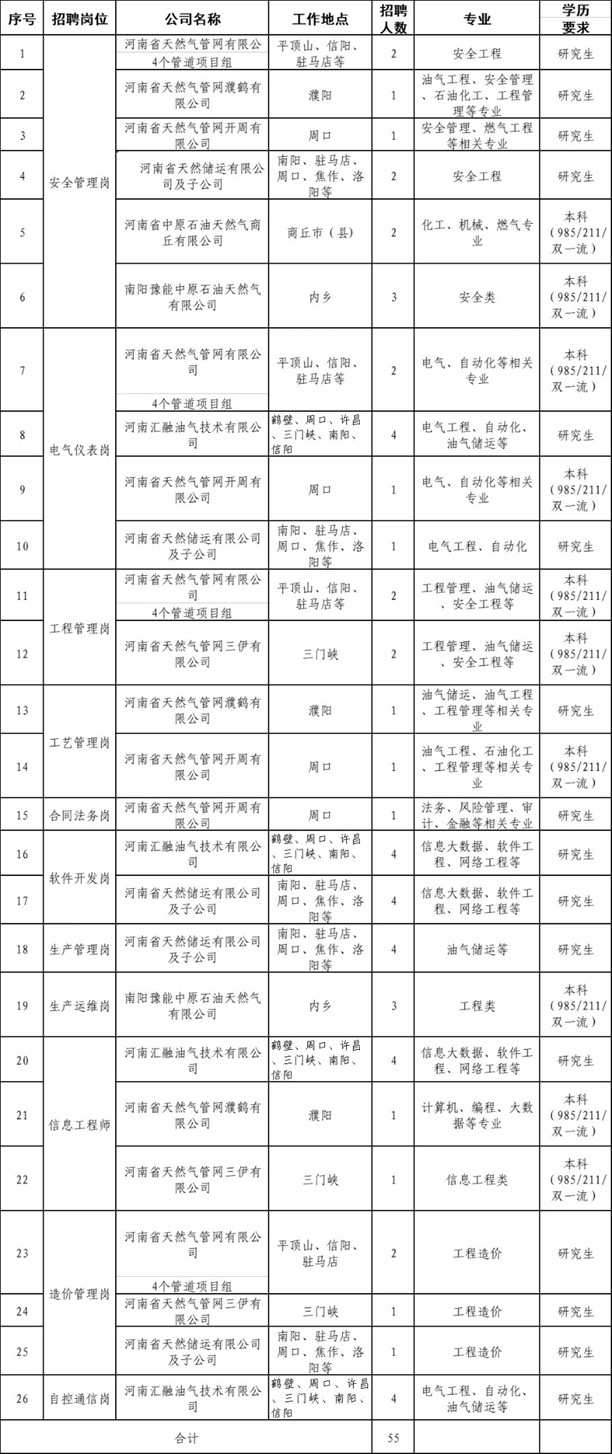 为满足战略发展需要,进一步提高公司经营管理水平,建设高素质、专业化的经营管理团队,诚邀优秀高校英才加盟河南省天然气管网有限公司,携手开创未来发展的新篇章。
