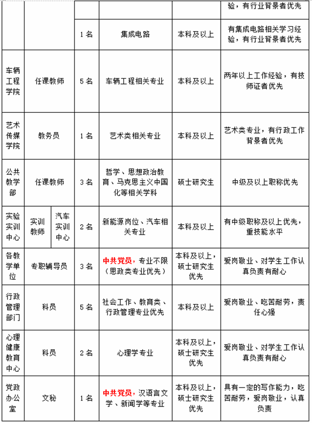 招聘对象:全日制优秀本科毕业生,应往、届硕士研究生,年龄一般不超过35周岁。具有高校从教经历、行业工作经验者,或中级及以上专业技术职务者优先。