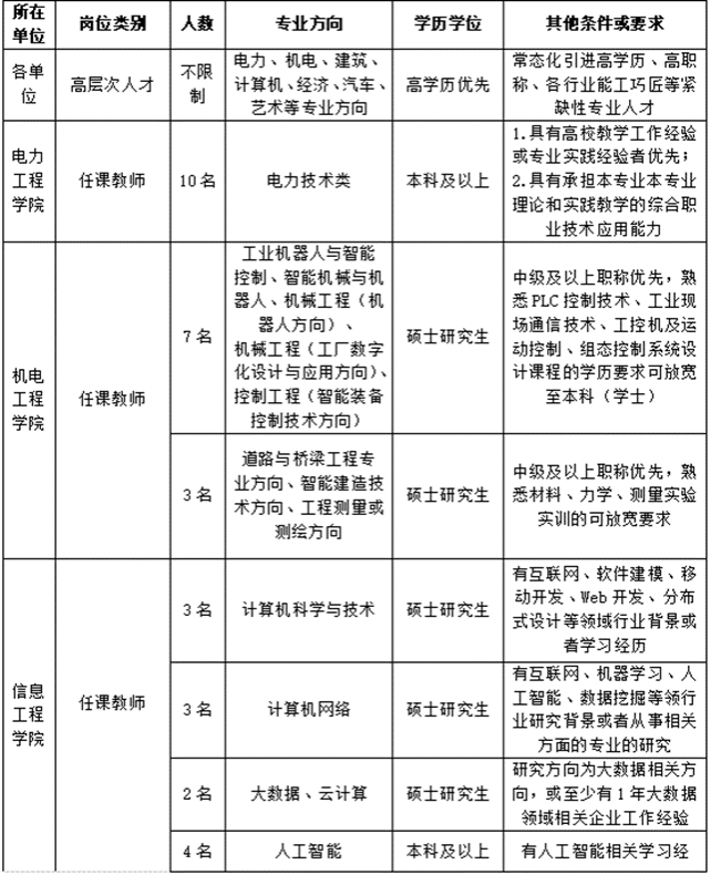 同时,学校常年引进高学历(博士研究生)、高职称(副高以上)、各行业能工巧匠等紧缺性专业人才,有意向者可投递简历。