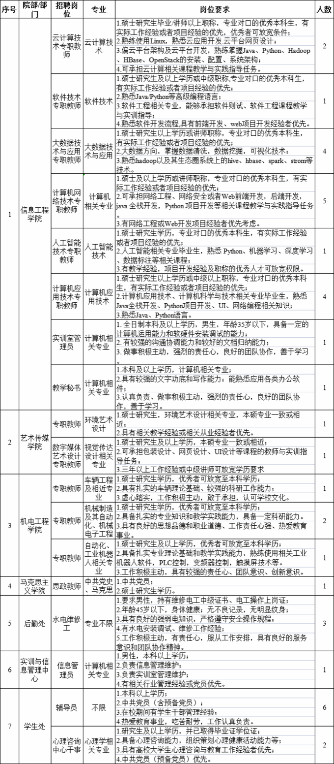 郑州理工职业学院因事业发展需要面向社会诚聘教师及行政人员,岗位招聘基本条件如下: