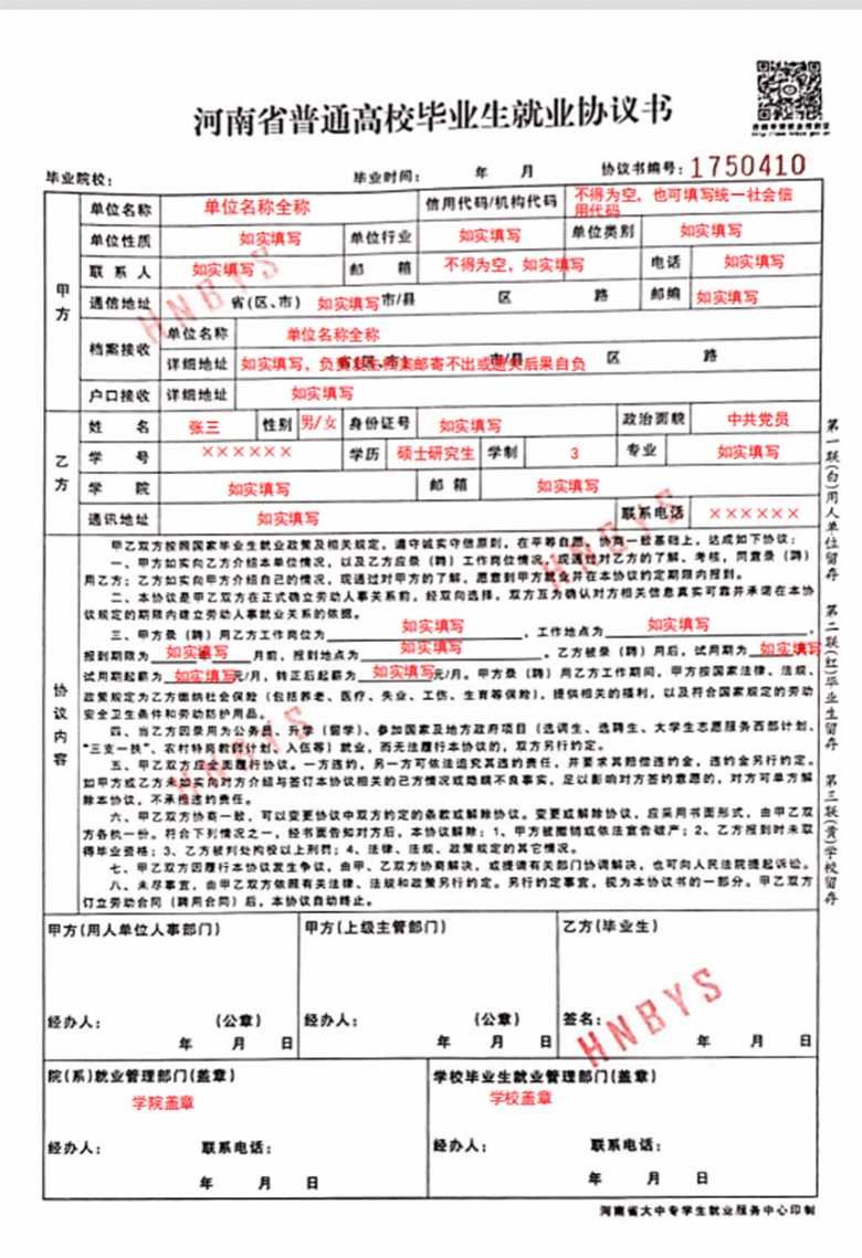 各学院把打印的成绩单(一份)与学生自行填好的就业推荐表(一份)以学院为单位到研工部、研究生院盖章,并以学院为单位从研工部领取就业协议书(需在每一页左下栏加盖学院公章),然后将领取的就业协议书(一式三份)一起发放至学生本人。毕业生本人必须取得毕业资格,如实向用人单位介绍本人在研究生学习期间的表现,只能与一个用人单位签订就业协议书。另外协议书需填满,如果有空白,尽量用“/”标记。