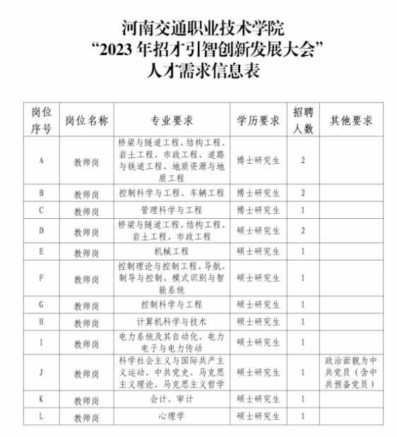 根据《河南省事业单位招聘工作规程》(豫人社〔2015〕55号文)及《中共河南省委组织部、河南省人力资源和社会保障厅、中共河南省委机构编制委员会办公室关于印发<河南省事业单位招才引智“绿色通道”实施细则>的通知》(豫人社般〔2022〕26号)要求,经学校研究决定,2023年拟通过“第六届中国·河南招才引智创新发展大会”公开招聘事业编制工作人员15名,其中博士研究生5名,硕士研究生10名。结合学校实际,制定本公开招聘方案。