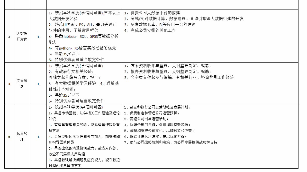 本次计划招聘岗位5个,招聘人数7人,其中前端工程师2人、后端工程师2人、大数据开发1人、文案策划1人、运营经理1人。