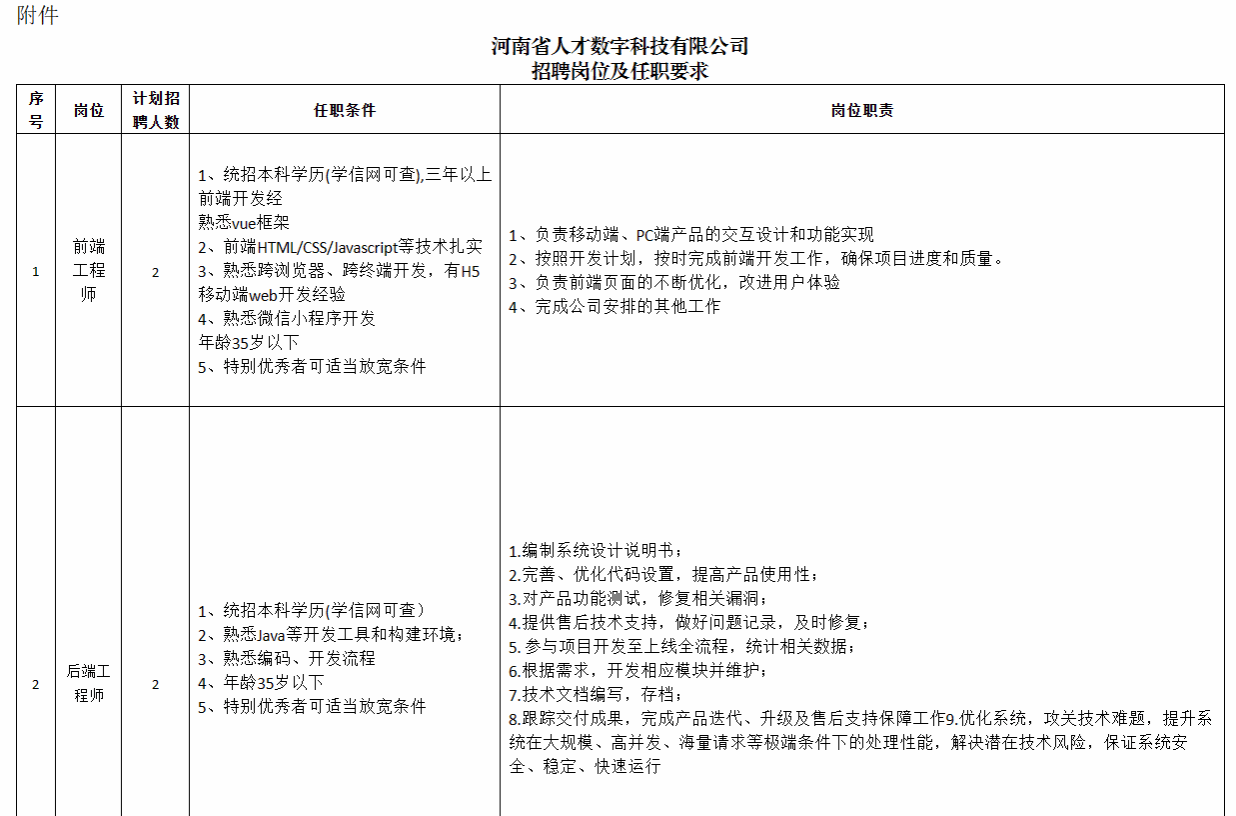 任职条件和岗位职责详见《河南省人才数字科技有限公司招聘岗位及任职要求》(附件)。