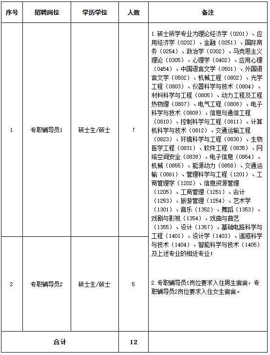 根据我校专业技术人员岗位空缺情况和学校发展需要,拟招聘硕士毕业生12名。招聘专业及计划见附件《河南工学院2024年公开招聘工作人员(硕士)一览表》(以国务院学位委员会、教育部印发的《研究生教育学科专业目录(2022年)》为准,学科括号内的专业方向仅为招聘岗位条件要求,不作为资格审核依据)。