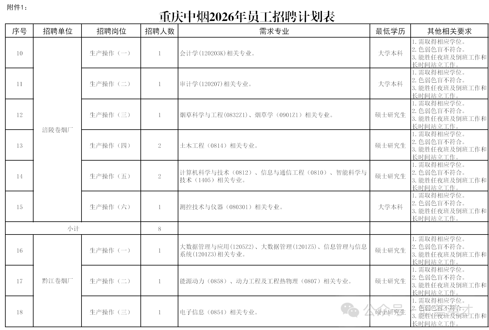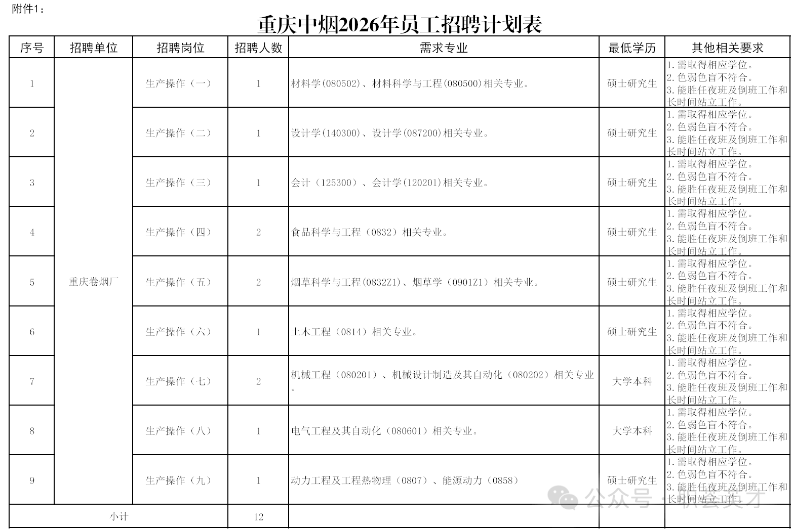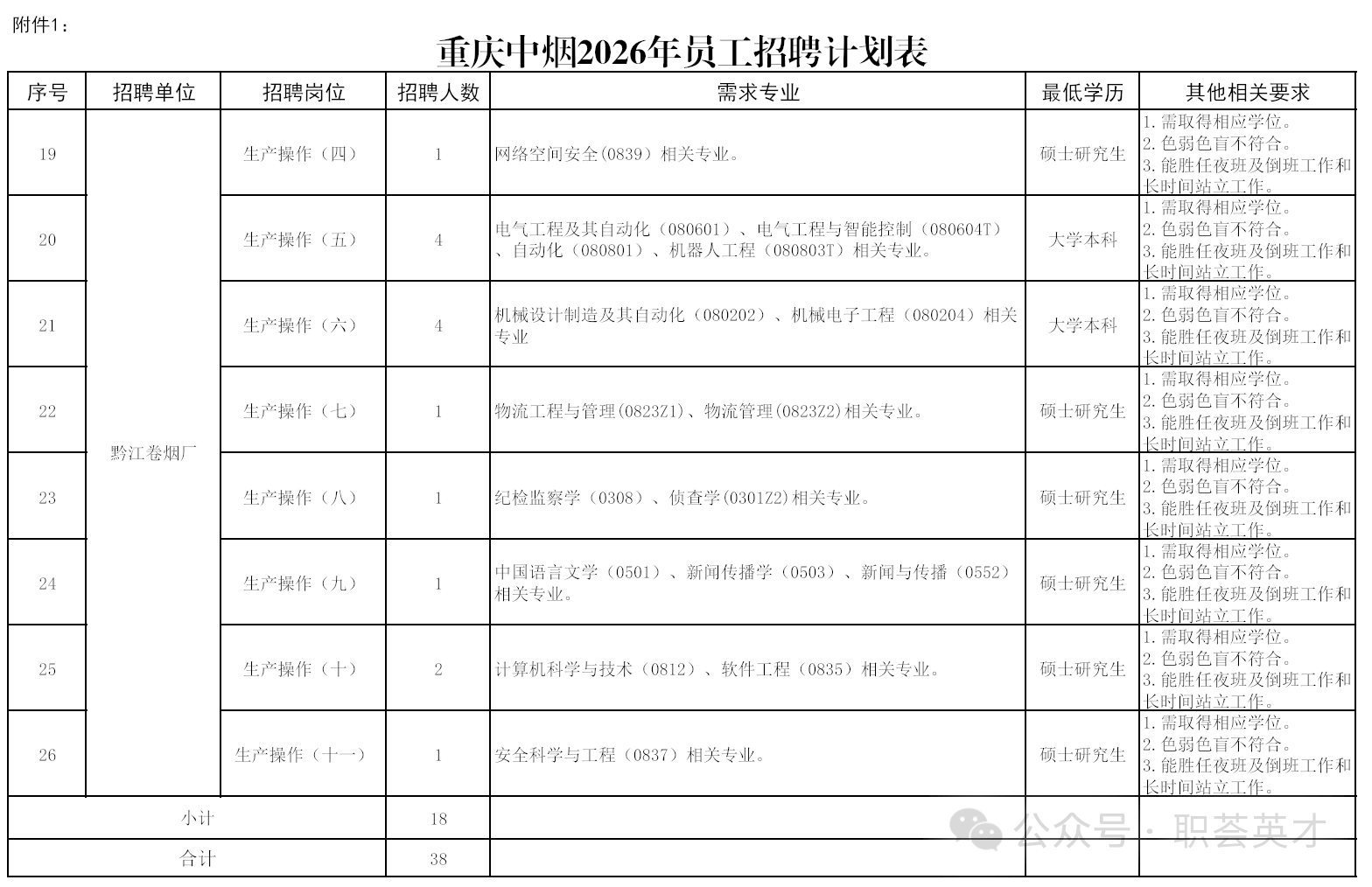 公司本次公开招聘38人,招聘单位、岗位、人数、专业及其他资格要求等详见《重庆中烟2026年员工招聘计划表》。