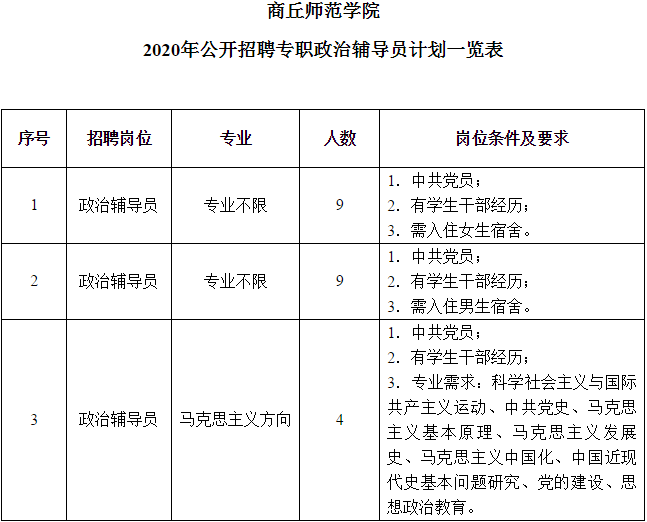 9.符合岗位所需的专业和其他条件(详见附件《商丘师范学院2020年公开招聘政治辅导员计划一览表》)。