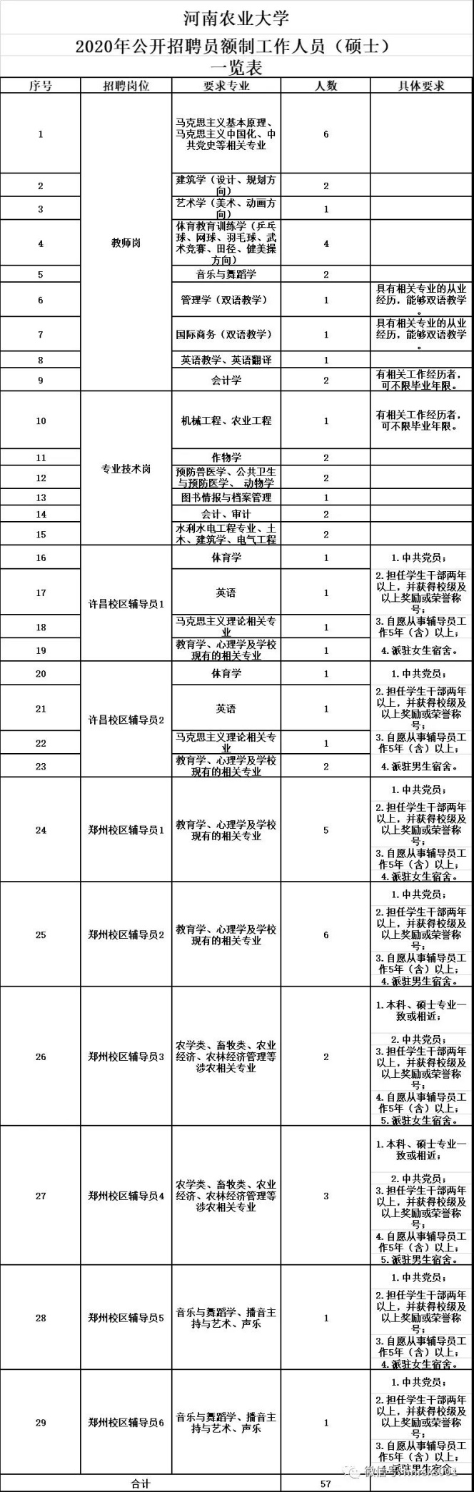 详见附件《河南农业大学2020年公开招聘员额制工作人员(硕士)一览表》。(点击图片可放大查看)