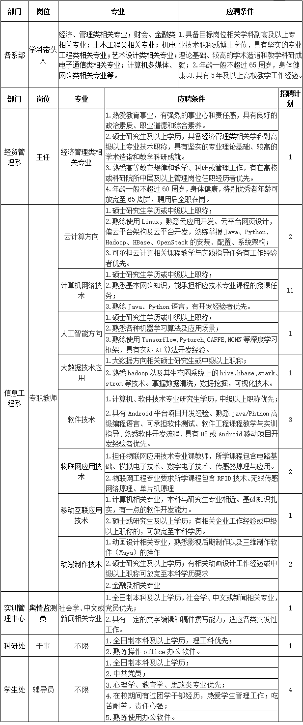 郑州理工职业学院因事业发展需要面向社会招聘系部主任、学科带头人和教师。岗位职责及任职基本条件如下: