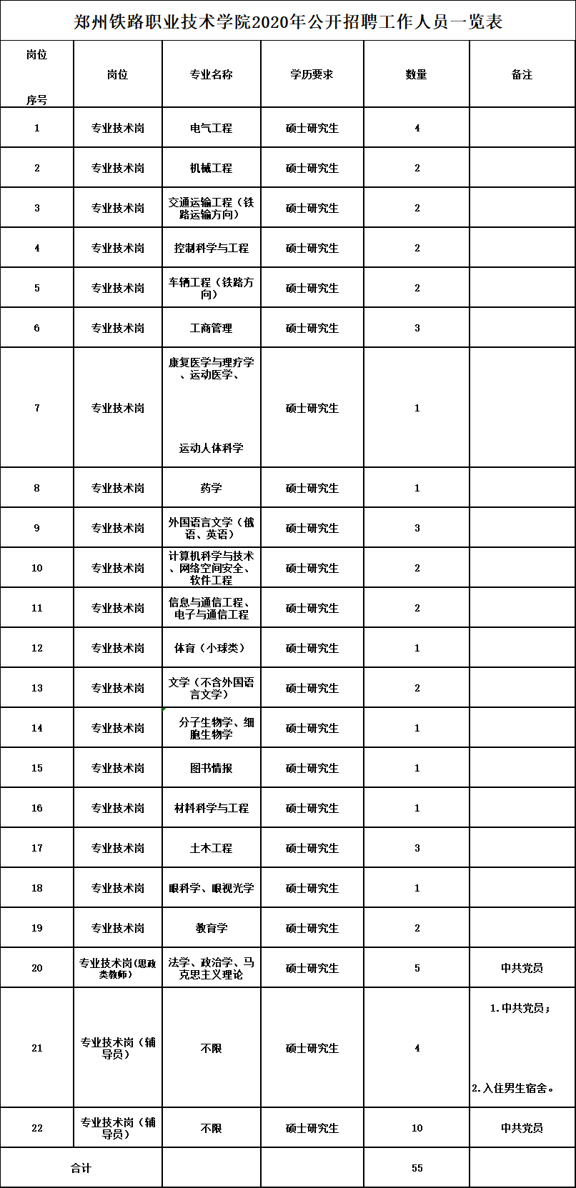 根据学校发展需要和专业技术人员岗位空缺情况,招聘55名硕士研究生及以上学历人员。详见附件《郑州铁路职业技术学院2020年公开招聘工作人员一览表》。
