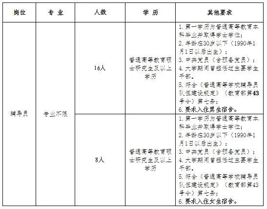 5.中共党员(含预备党员),大学期间曾担任主要学生干部;6.其他条件。符合《普通高等学校辅导员队伍建设规定》(教育部第43号令)第七条。