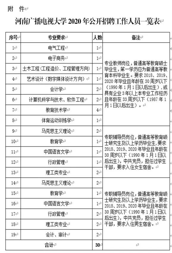 根据教师岗位空缺情况和学校事业发展需要,2020年,拟公开招聘30名工作人员。招聘专业及计划见附件《河南广播电视大学2020年公开招聘工作人员一览表》。