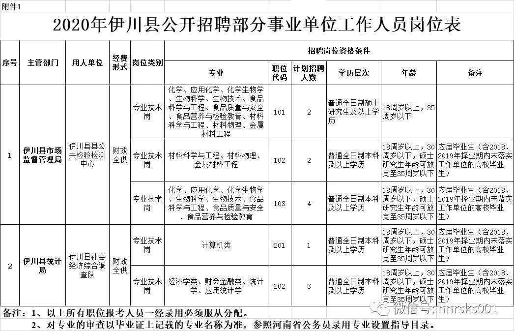 二、招聘岗位、专业及计划招聘岗位、招聘人数、招聘岗位条件等详见《2020年伊川县公开招聘部分事业单位工作人员岗位表》(附件1)。(点击图片可放大查看)