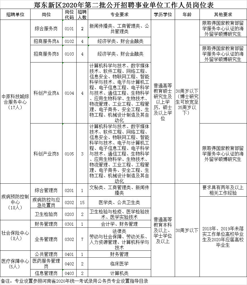 招聘郑州中原科技城综合服务中心17名、郑东新区疾病预防控制中心18名、郑东新区社会保险中心8名、郑东新区医疗保障中心5名事业单位工作人员,具体招聘岗位、人数、资格条件等详见《郑东新区2020年第二批公开招聘事业单位工作人员岗位表 》。