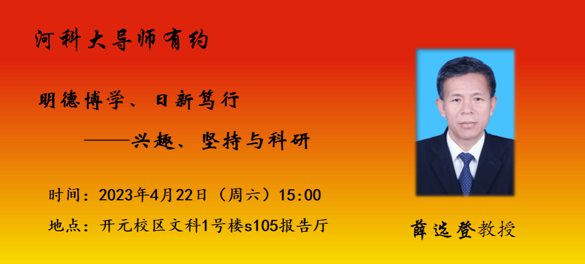 《导师有约》是河南科技大学党委研究生工作部/研究生院打造的知名教授、校内外贤达人士与研究生促膝畅谈、心灵交流、分享经历、共话精神的校园文化品牌。本期特邀嘉宾是硕士研究生导师薛选登教授,如果你想手捧香茗与名师对话,如果你想请他释疑解惑,薛选登教授等你来共话人生。欢迎你踊跃报名!