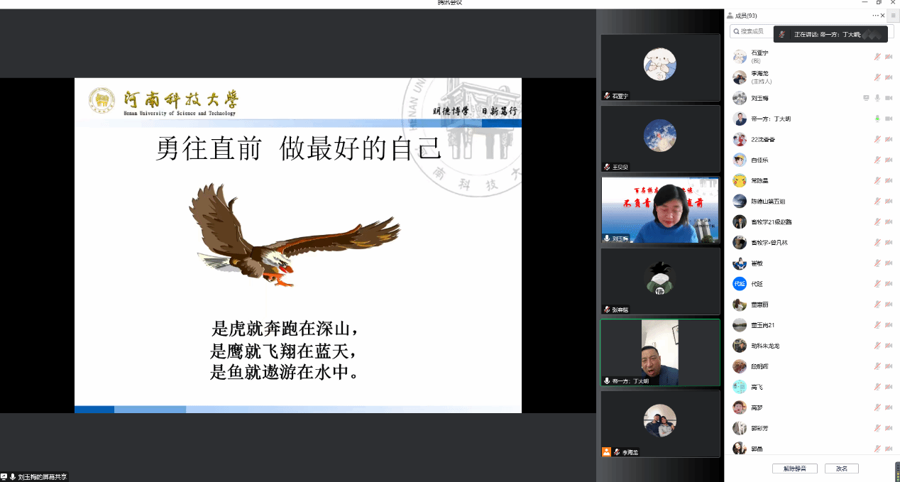 12月13日下午,由党委研究生工作部/研究生院主办、动物科技学院承办的“百名校友创新创业谈”——丁大明校友创新创业报告会通过线上会议的形式举办。本次报告会主题为“不负青春,勇往直前”。应邀出席的嘉宾是河南省帝一方集团总裁丁大明先生。本次座谈会由动物科技学院副院长刘玉梅老师主持,全体2022级研究生参加。