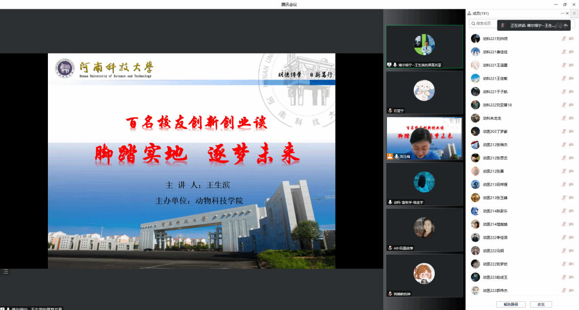 12月15日下午,由党委研究生工作部/研究生院主办、动物科技学院承办的“百名校友创新创业谈”——王生滨校友创新创业报告会于线上开展。本次报告会主题为“脚踏实地,逐梦未来”。应邀出席的嘉宾是维尔塔宁集团董事王生滨先生。本次座谈会由动物科技学院副院长刘玉梅老师主持,动物科技学院全体研究生参加。