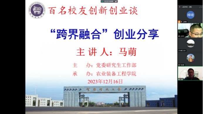 2023年12月16日下午,农业装备工程学院举办了“百名校友创新创业谈”报告会。此次会议邀请到了2014届河南科技大学农业工程硕士研究生、现任元明新兆源基金投资副总裁马萌,为大家分享一些创业经验。学校辅导员王升升老师、农业装备工程学院全体研究生参加此次会议。