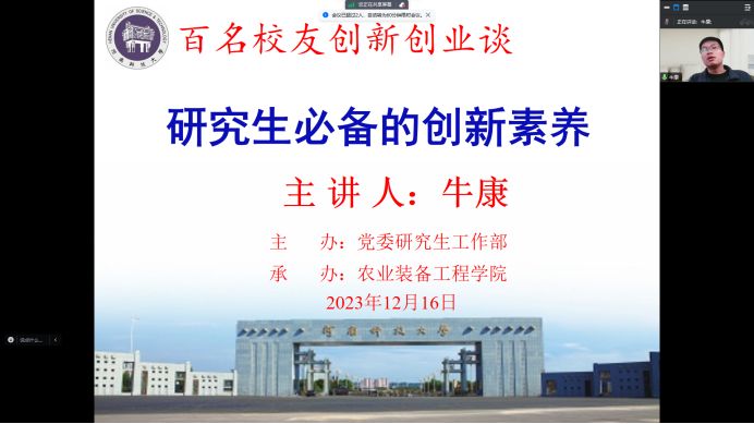 2023年12月16日上午,农业装备工程学院举办了“百名校友创新创业谈”报告会。此次会议邀请到了2013届河南科技大学农业工程硕士研究生、现任中国农业机械化科学研究院集团有限公司机电所农机智能装备研究室主任,中国农业机械化科学研究院、河南科学大学、沈阳农业大学和安徽科技学院等高校的硕士生导师牛康,为大家分享一些经验。学校辅导员王升升老师、农业装备工程学院全体研究生参加此次会议。