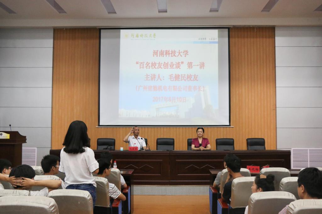 88级焊接专业校友、广州建德机电有限公司董事长毛健民先生担任“百名校友创新创业谈”首场报告主讲嘉宾。他以“我的创业之路”为题,分析了对“创新创业”的理解,回忆了自己的成长历程,讲述了从走出校门到成为飞马集团“焊接大王”,到许继集团深圳分公司、命名“伸缩门”的工作历程,再到创业建立广州建德机电有限公司,并致力于对各类立体机械停车设备研发推广的起起伏伏,分享了创业成功的收获和感悟。他说,大学的学习改变了自己的命运,正是由于经过了大学的系统学习,使他很快就在初次入职的企业得到重用,积累了工作经验。“机会总是留给有准备的人”,他认为年轻人创业必须做好知识准备,告诫同学们在学校要打好基础,学好知识,尽量选择能发挥自己优势的行业,才能抓住创业成功的机会。对于创业的定义,毛健民校友有着自己的理解。他认为,自己做老板是创业,为别人打工也是创业,“每份工作都是创业,不一定要注册公司”,告诫同学们一定要端正工作态度,踏踏实实地工作。他以大量生动的例子告诉每一位追求成功的同学都要首先学会“做人”,学会守时守信的与人相处。他还和大家分享了几点感悟:“有目标,有追求”,保持“执着,担当”,学会“完美,真诚”……毛健民校友以生动风趣、开阔眼界、引人入胜的报告,引起了同学们心灵强烈的震撼,赢得了听众一次又一次热烈的掌声。