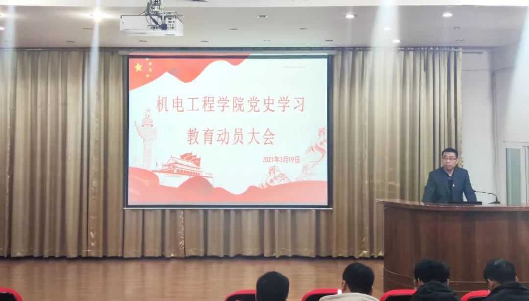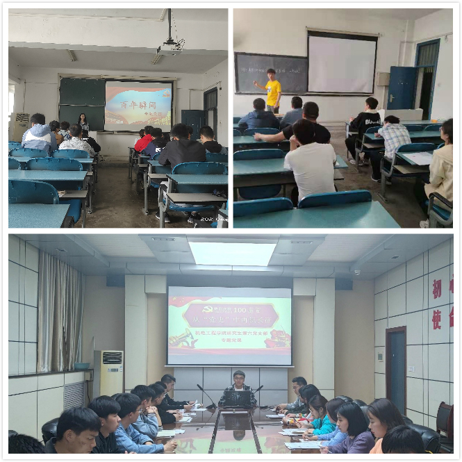 机电工程学院党委书记张松敏老师指出2021年是中国共产党成立的一百周年,同学们要认真学习贯彻习近平总书记在党史学习教育动员大会上的重要讲话精神,高标准高质量扎实开展党史学习教育,学史明理、学史增信、学史崇德、学史力行,做到学党史、悟思想、办实事、开新局,以建设一流大学的实干与成绩迎接中国共产党成立100周年。随后,张书记以中国共产党召开的十九次全国人民代表大会为主线,从中国共产党成立的历史背景到第十九次全国人民代表大会的成功召开,详细地为同学们介绍了中国共产党这一百年的发展历程。张书记的语言生动详实,深入浅出,使得同学们对党的历史有了更加深刻的理解。回顾党的历史,同学们才深刻体会到党在成立之初是多么艰难,今天的幸福生活是多么的来之不易,更加坚定了同学们一心一意跟党走的理想信念!最后,张老师引用习近平总书记在“不忘初心、牢记使命”主题教育总结大会的发言来作为结语,告诉同学们必须始终保持崇高的革命理想和旺盛的革命斗志,敢于直面问题,勇于修正错误。