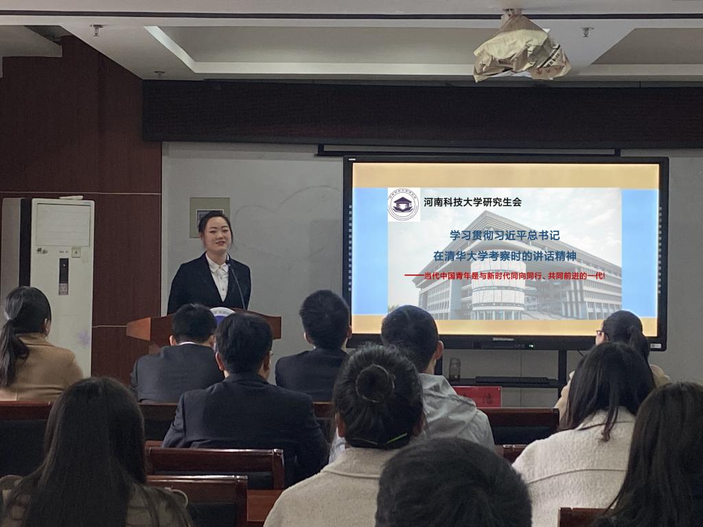 会议伊始,曹君娴带领大家观看了习近平总书记在考察清华大学时的视频并学习了重要讲话。她说“任何一个团体都需要统一的思想引领,才能更好地发展前行,更深刻地认识到身上肩负的时代使命和责任担当。”她倡导研究生会全体成员通过学习,积极展开讨论,畅谈内心感悟,在讲话精神的指引下砥砺前行,让青春在不懈奋斗中绽放绚丽之花。随后,学生代表分享了自己的学习心得。